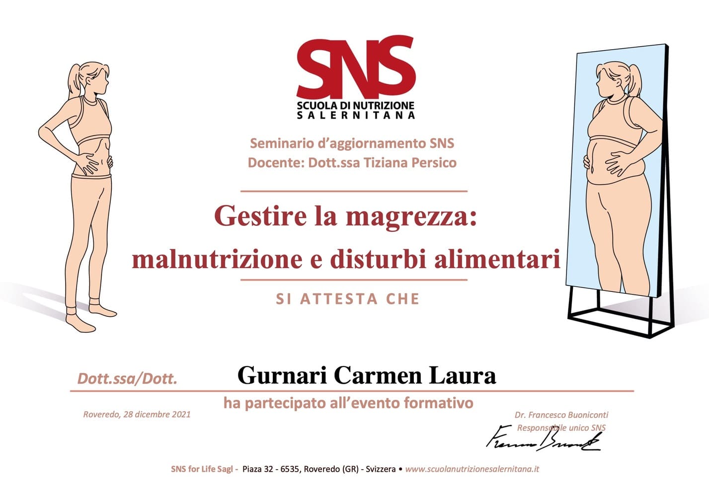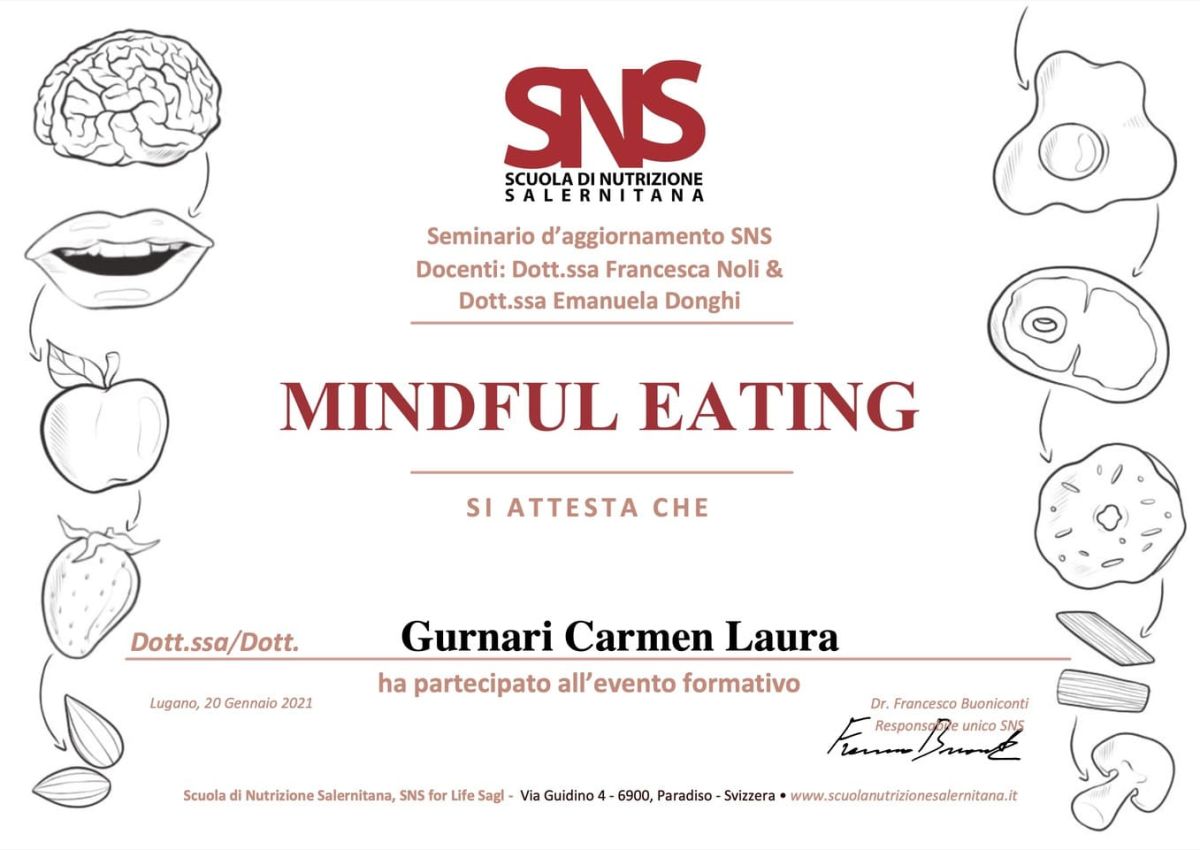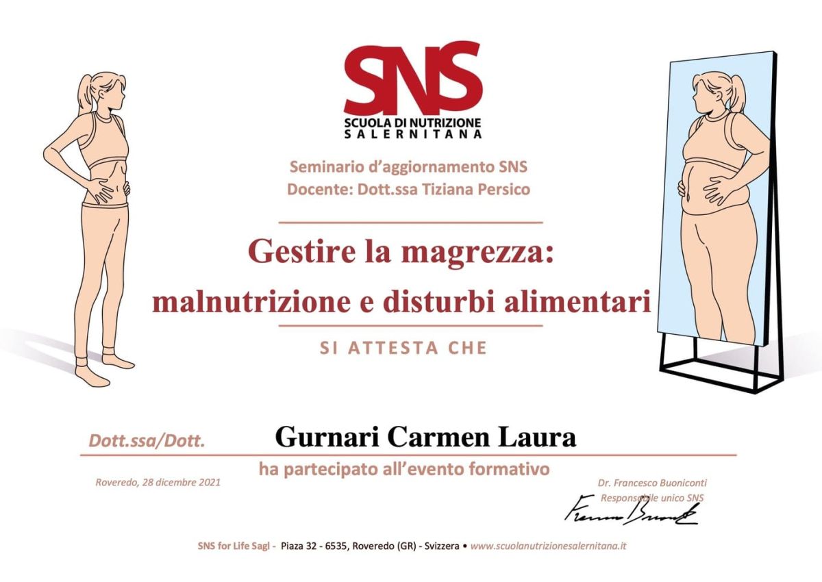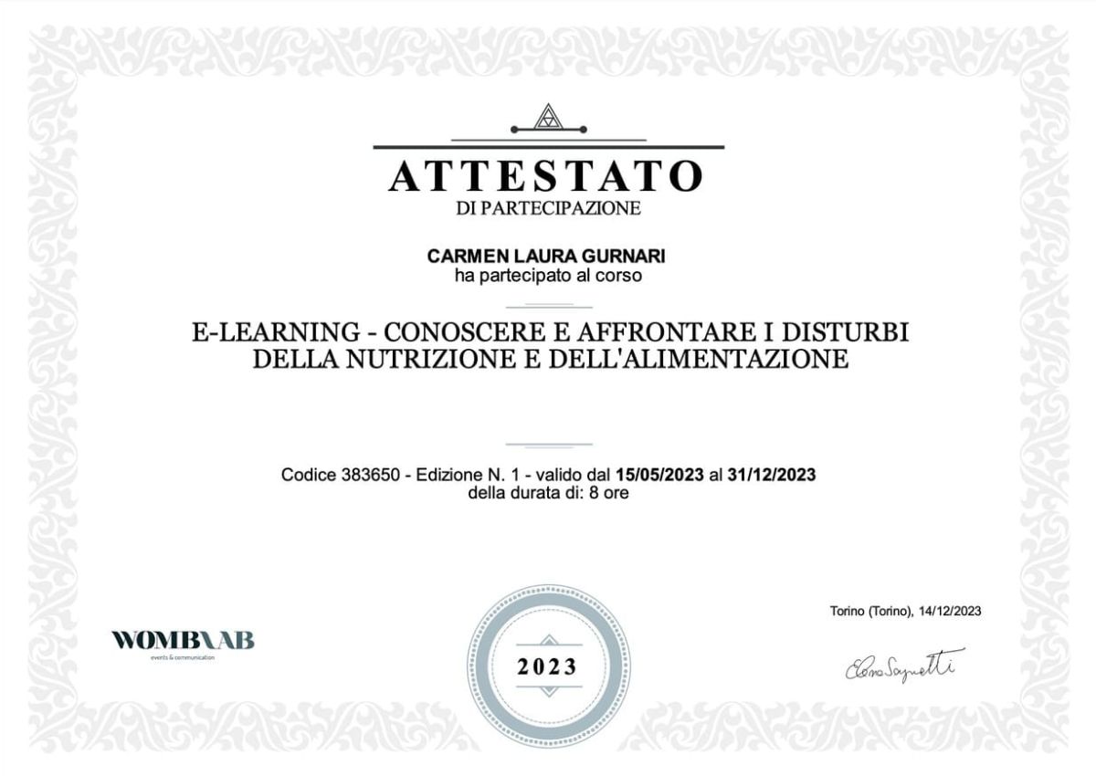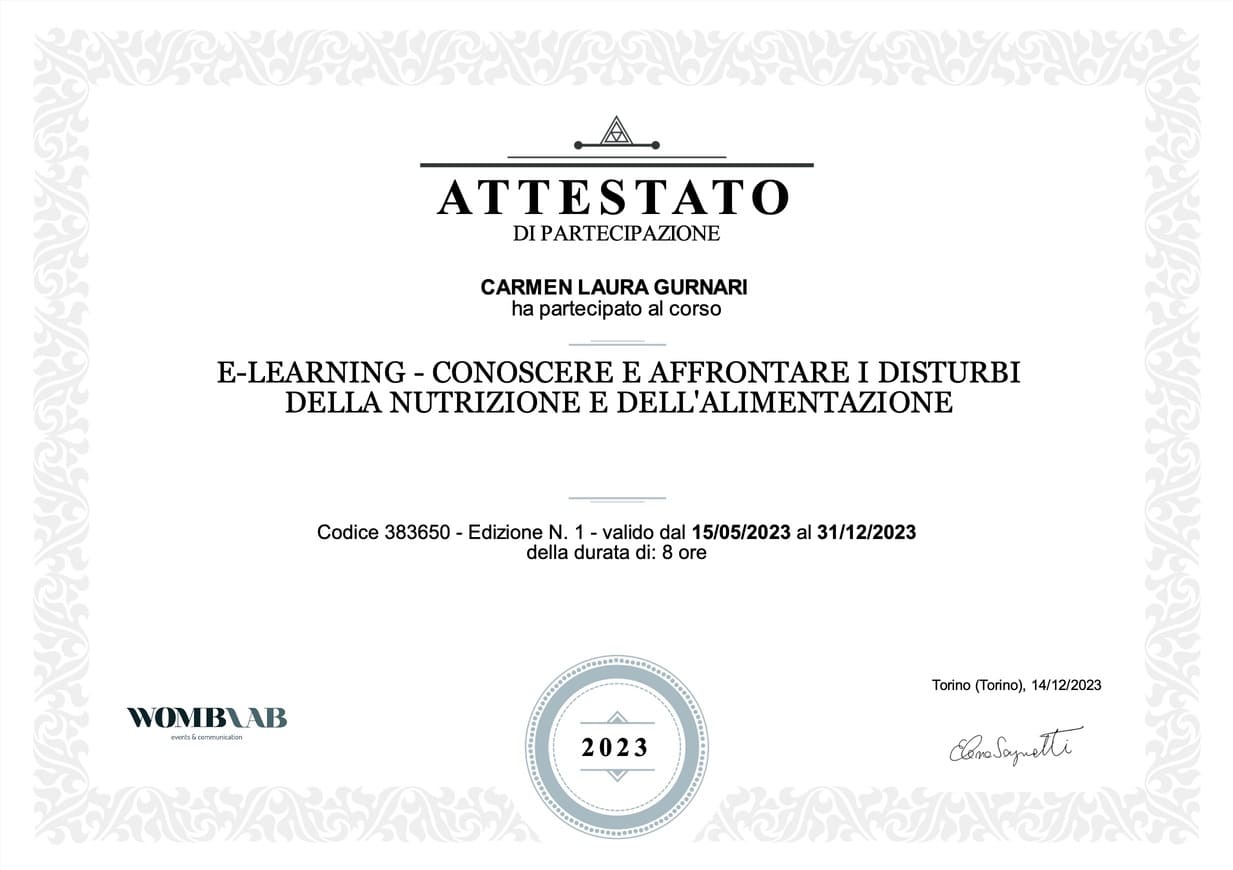 - Ottobre 2025-Giugno 2026: Master di Alta Formazione "Clinica e trattamento dei disturbi dell'alimentazione e della nutrizione"di Psicoterapicamente.