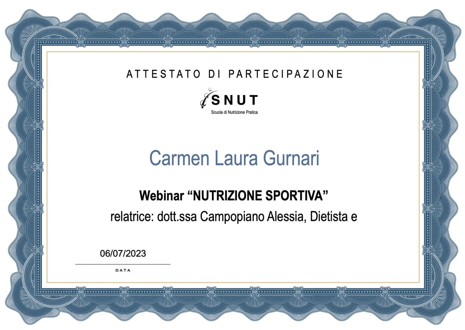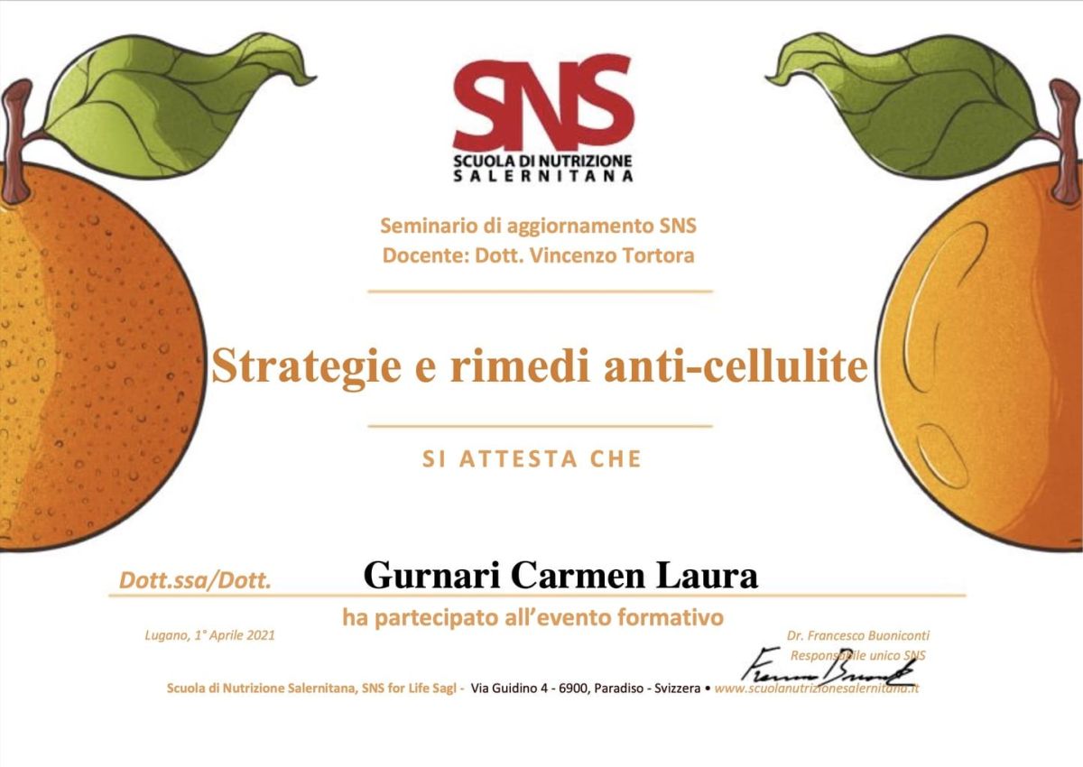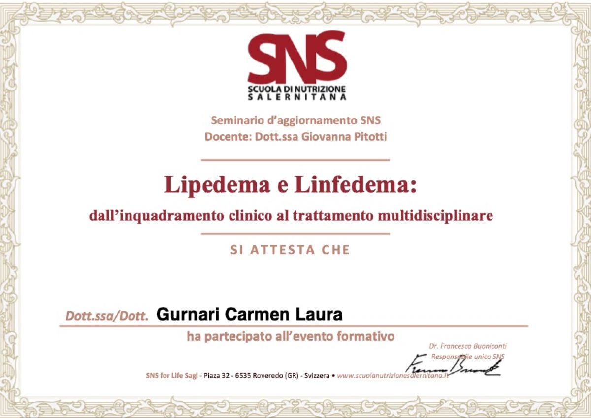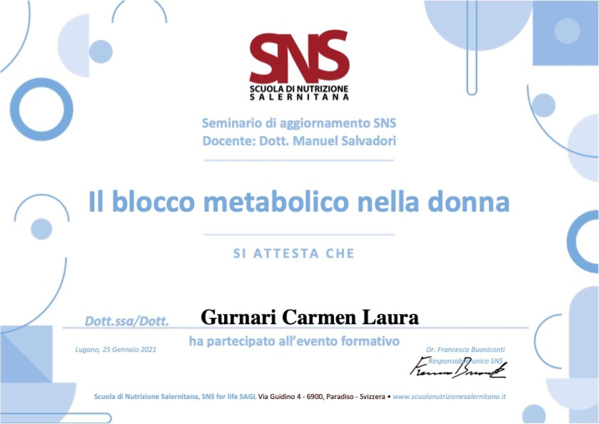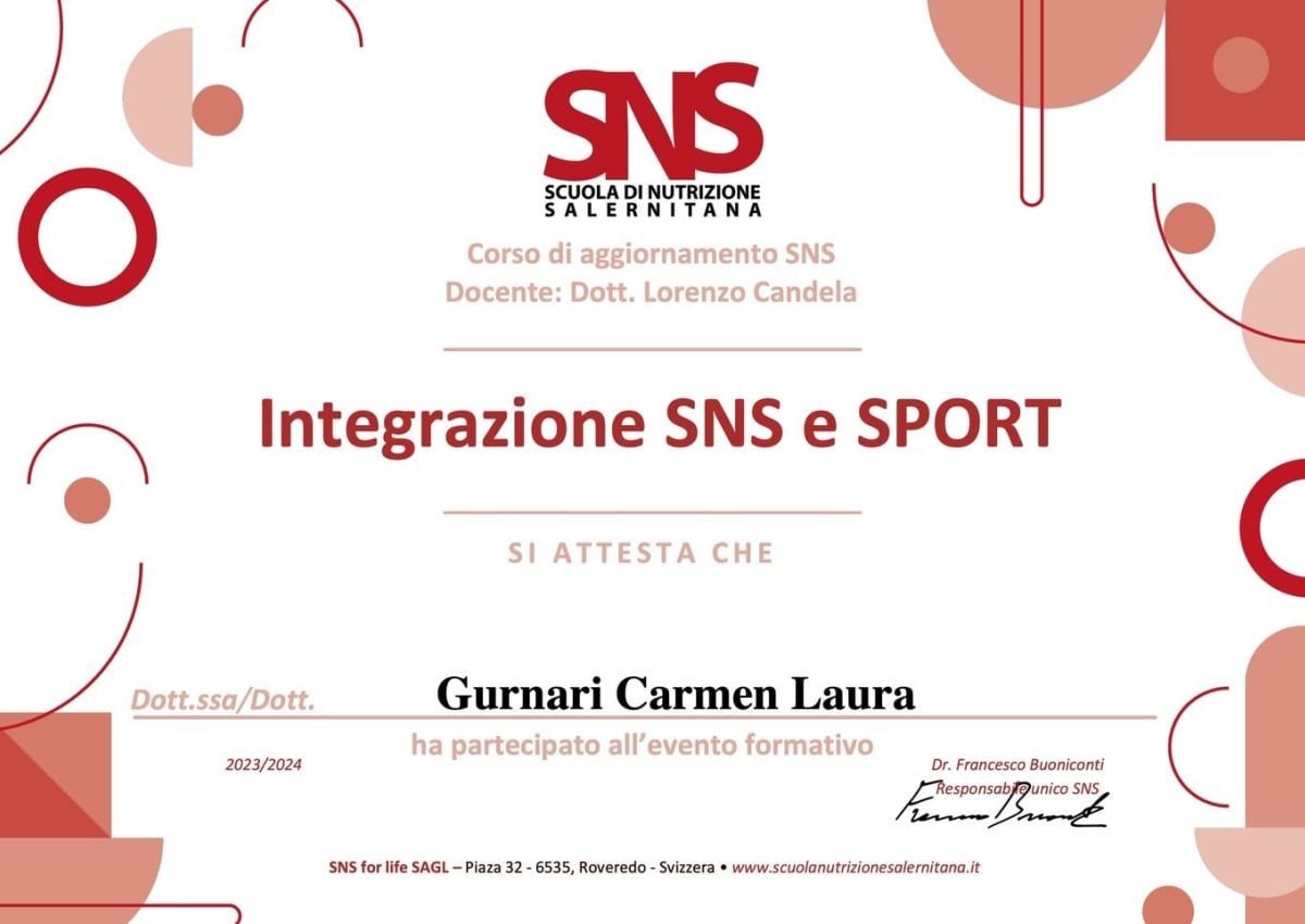 - 2021: Stage presso il reparto di endocrinologia, diabetologia e dietologia dell’Ospedale di Reggio Calabria, con focus sull’elaborazione di diete personalizzate per pazienti con storie fisiopatologiche diverse.